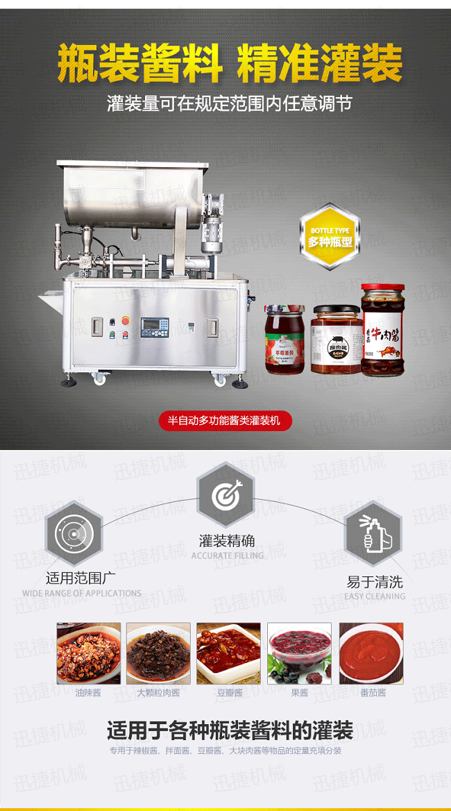 本瓶裝辣椒醬灌裝機(jī)專用于辣椒醬、拌面醬、豆瓣醬、大塊肉醬等物品的定量充填分裝,適合于將各類粘稠體及含有各種固體物質(zhì)如辣椒、花生、肉塊、佐料等物體的醬類灌裝各種容器中,適用于各種瓶裝醬料的灌裝。