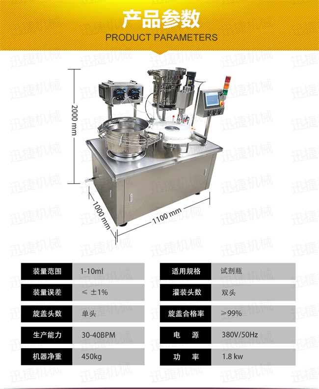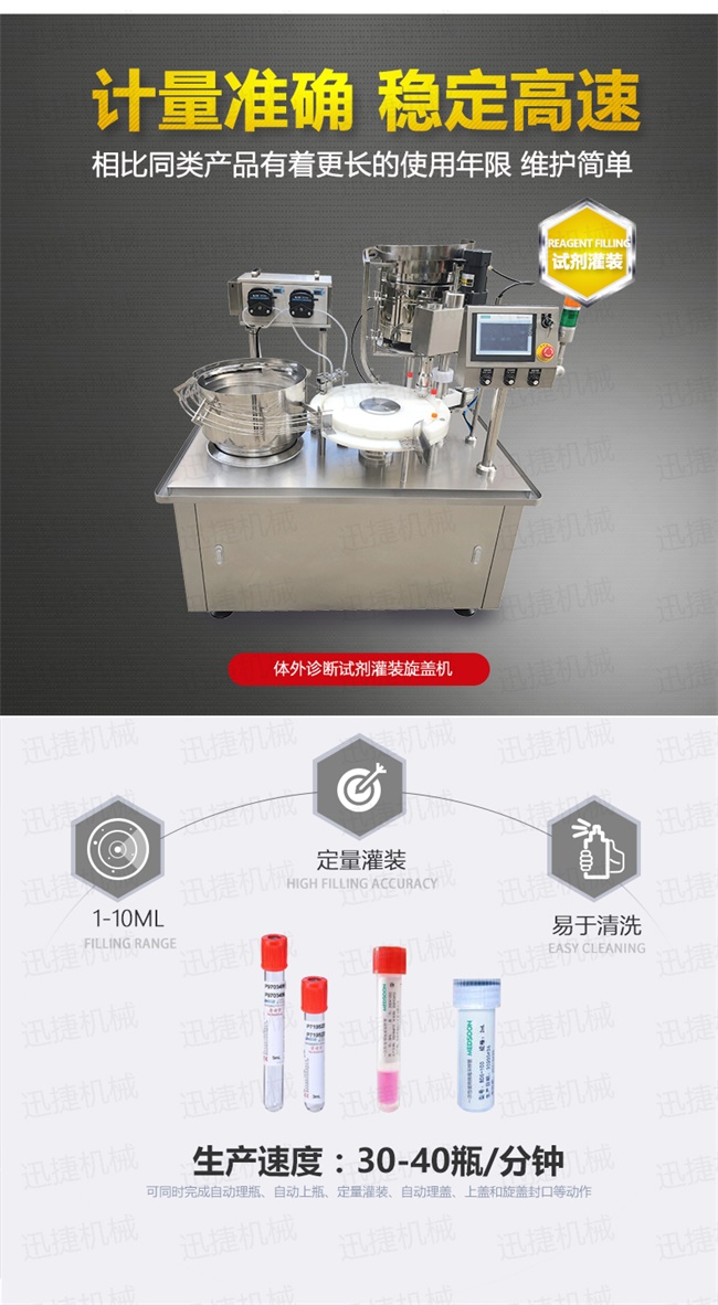 本機是在引進和吸收國外技術的基礎上,由我公司自主研發的一款IVD診斷試劑灌裝旋蓋一體機,能同時完成自動理瓶、自動上瓶、定量灌裝、自動理蓋、上蓋和旋蓋封口等動作。本機采用日本高精度封閉式凸輪分度工位器,精度高,運行可靠,使用壽命長。該分度器結構簡單,長期使用無需維修。該型號設備主要用于ⅣD體外診斷試劑制藥、生物制藥行業及科研領域裝。機器設計緊湊合理、外形簡潔美觀,灌裝量調節方便。