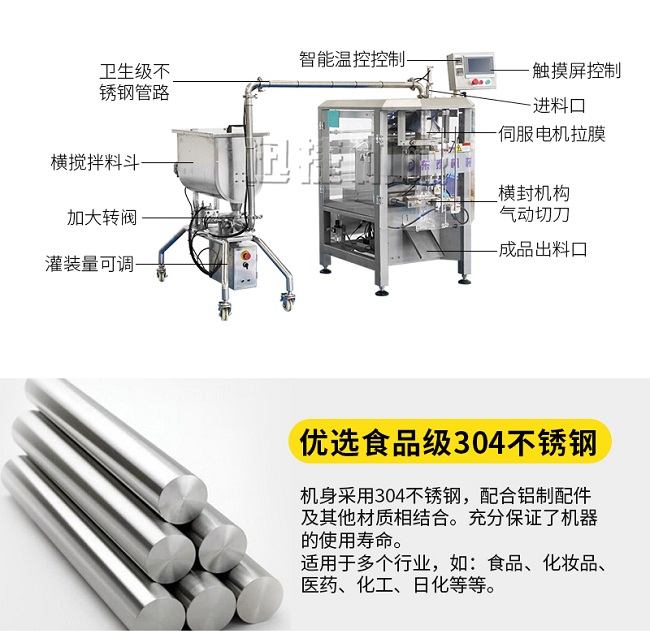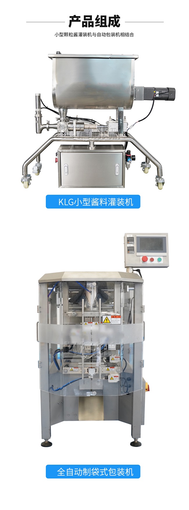 本機器主要用于調味品醬料的自動化包裝,機器安裝有橫向螺帶式攪拌,使油醬混合均勻,確保灌裝精度和產品包裝成品的均勻性。灌裝計量設備安裝有萬向輪,管路鏈接均采用快拆接頭,方便灌裝機拆卸移動清洗。包裝設備采用全伺服驅動器,包裝速度快,運行穩(wěn)定。設備構成組件:攪拌式定量灌裝機一臺管道鏈接組件2米。