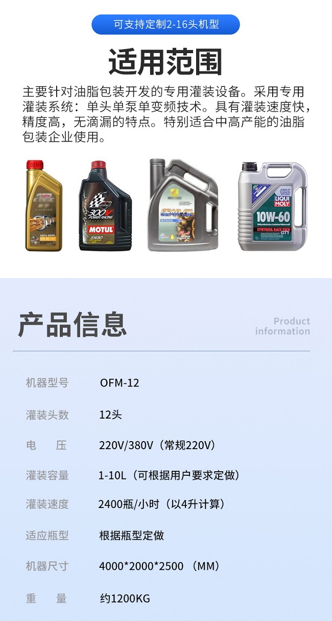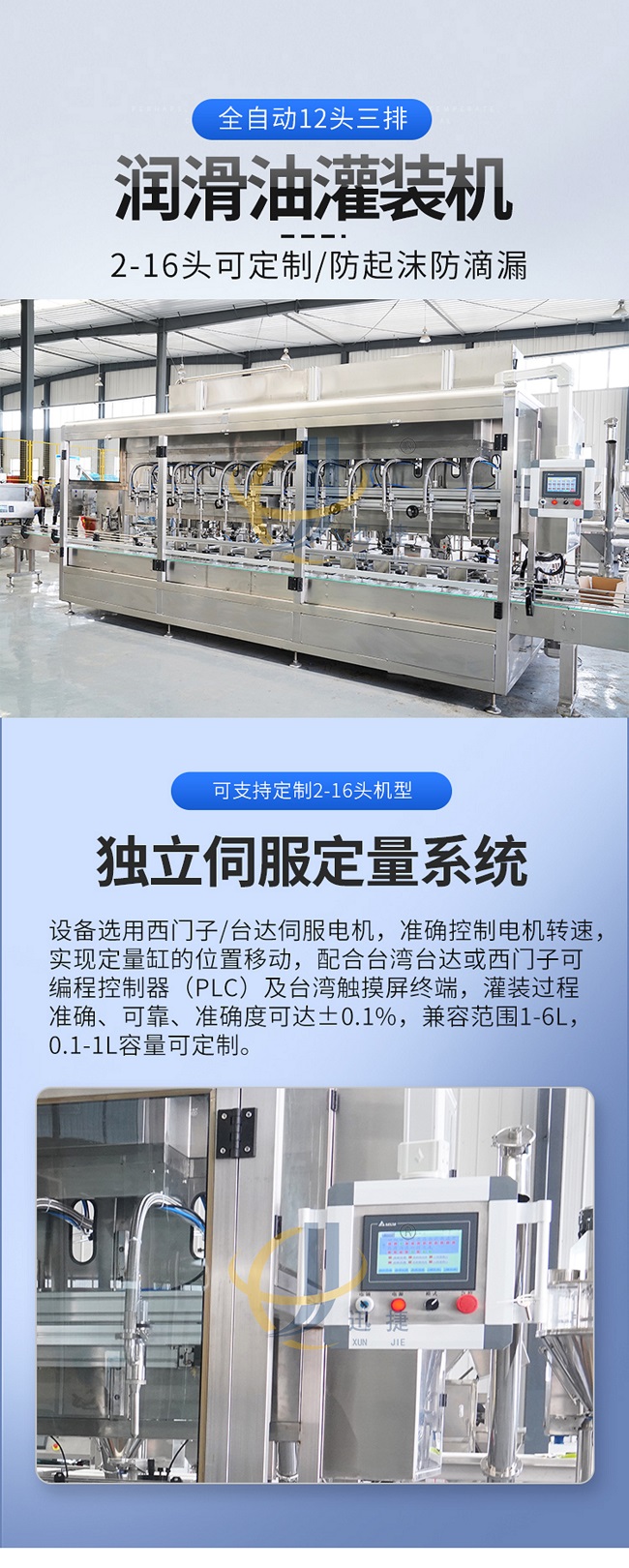 這款全自動(dòng)十二頭三排潤(rùn)滑油灌裝機(jī)是本公司專為潤(rùn)滑油廠家研發(fā)的自動(dòng)化設(shè)備,這款潤(rùn)滑油灌裝機(jī)2-16頭可定制,防起沫防滴漏。主要針對(duì)油脂包裝開發(fā)的專用灌裝設(shè)備。采用專用灌裝系統(tǒng):?jiǎn)晤^單泵單變頻技術(shù)。具有灌裝速度快,精度高,無滴漏的特點(diǎn)。特別適合中高產(chǎn)能的油脂包裝企業(yè)使用。
