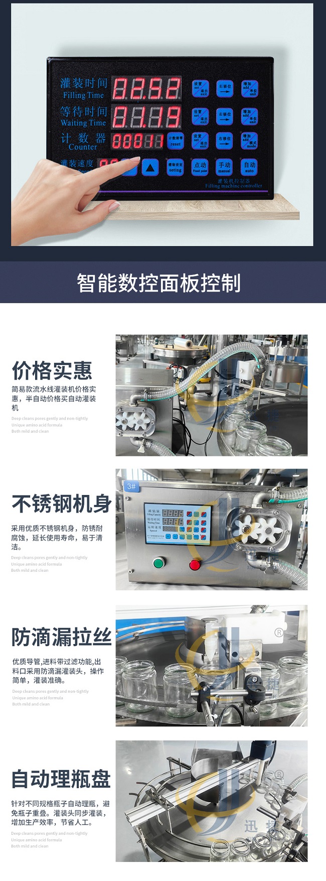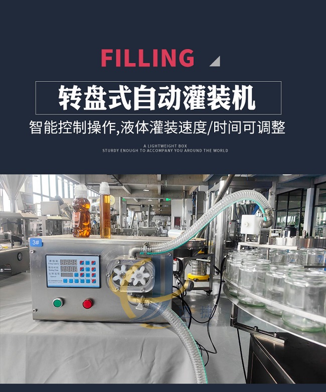 這款轉盤式蜂蜜膏液灌裝機采用智能控制操作,液體灌裝速度/時間可調整,廣泛應用于食品、飲料、化妝品、藥物、化工等行業中。