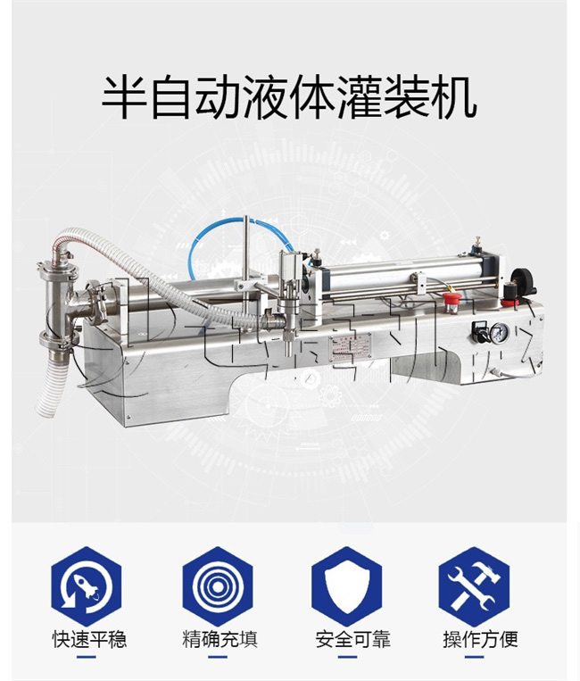 半自動液體灌裝機有單頭、雙頭液體灌裝機兩種,它適用于日化行業、醫藥行業、食品行業、油墨行業和涂料行業的液體灌裝,此小型液體灌裝機設計合理,機型小巧,操作方便,是外各個中小型企業灌裝的幫手。。